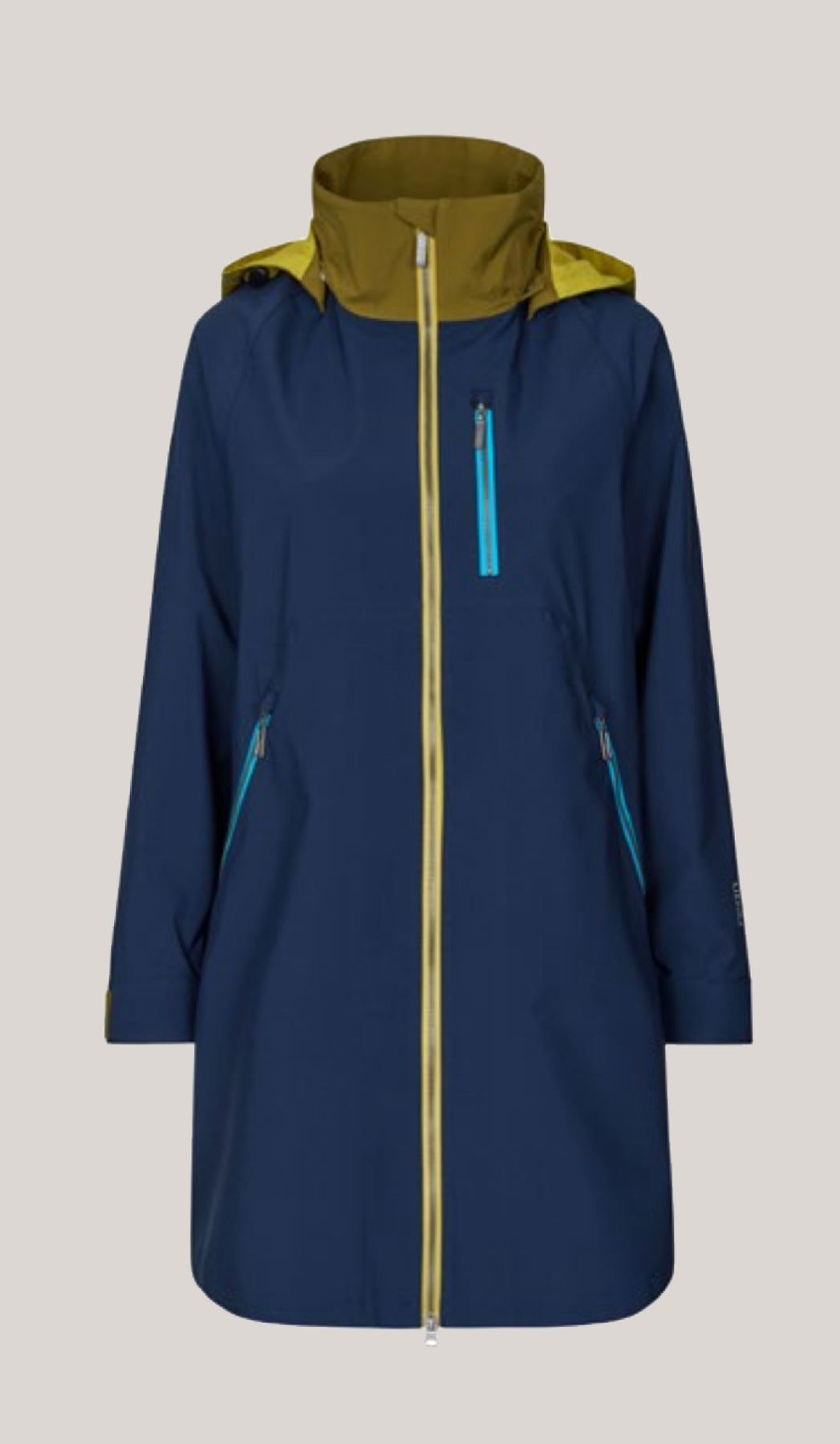 The sophisticated Jasmin Raincoat is a perfect fusion of style and practicality. Designed with fully taped seams, it offers exceptional waterproof protection and a loose A-line silhouette that flatters effortlessly. The medium-length coat includes eyelets under the sleeves for breathability and discreet reflex details for enhanced visibility in various conditions. A concealed front zip under a flap with press buttons and a foldable hood integrated into the collar provide versatility and comfort. Practical elements such as front pockets with press buttons, zipped side pockets, and a secure inner zipped pocket make it an ideal choice for daily wear. The adjustable cuffs and side splits, with contrasting prints and zips, offer ease of movement and a unique, stylish touch.