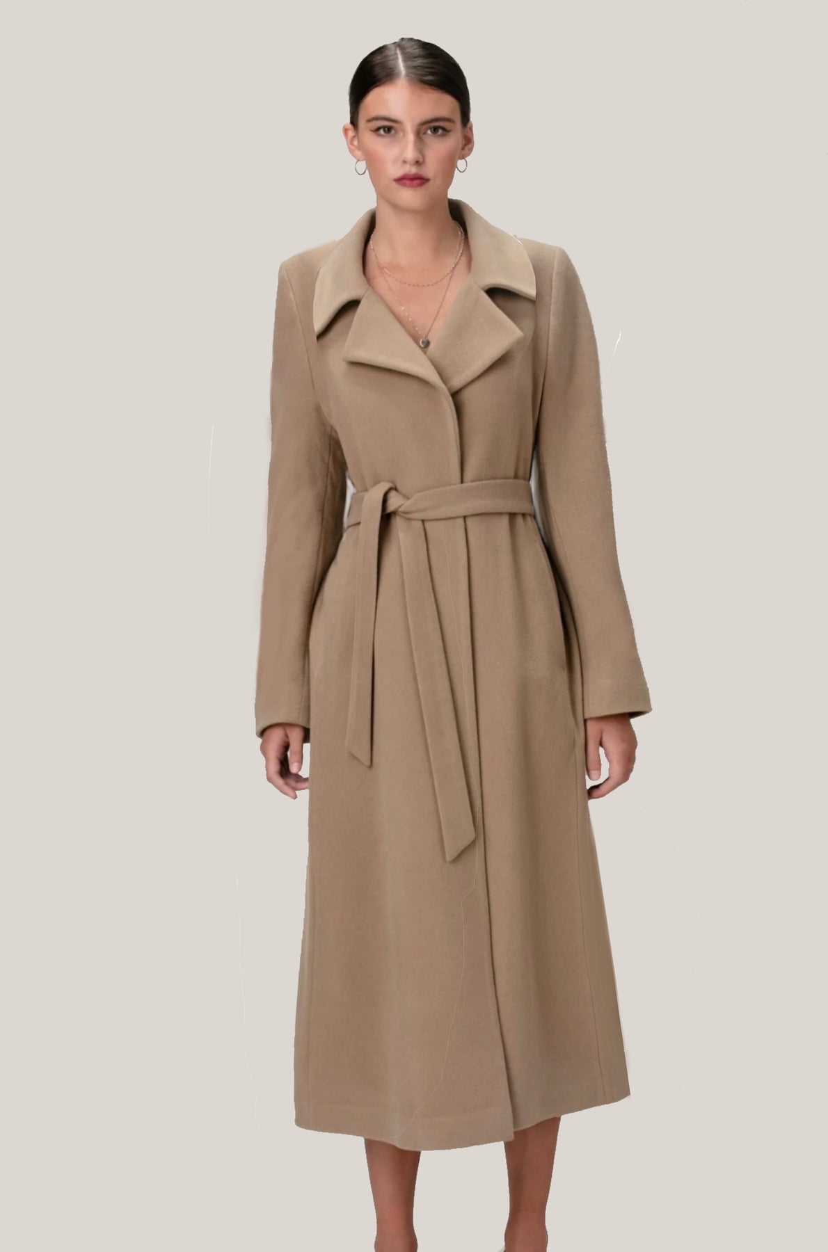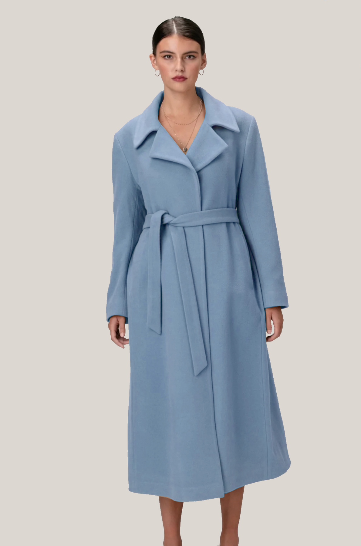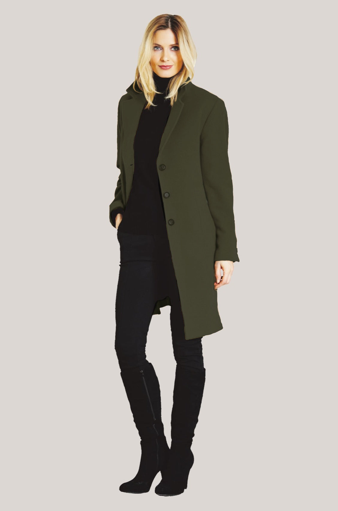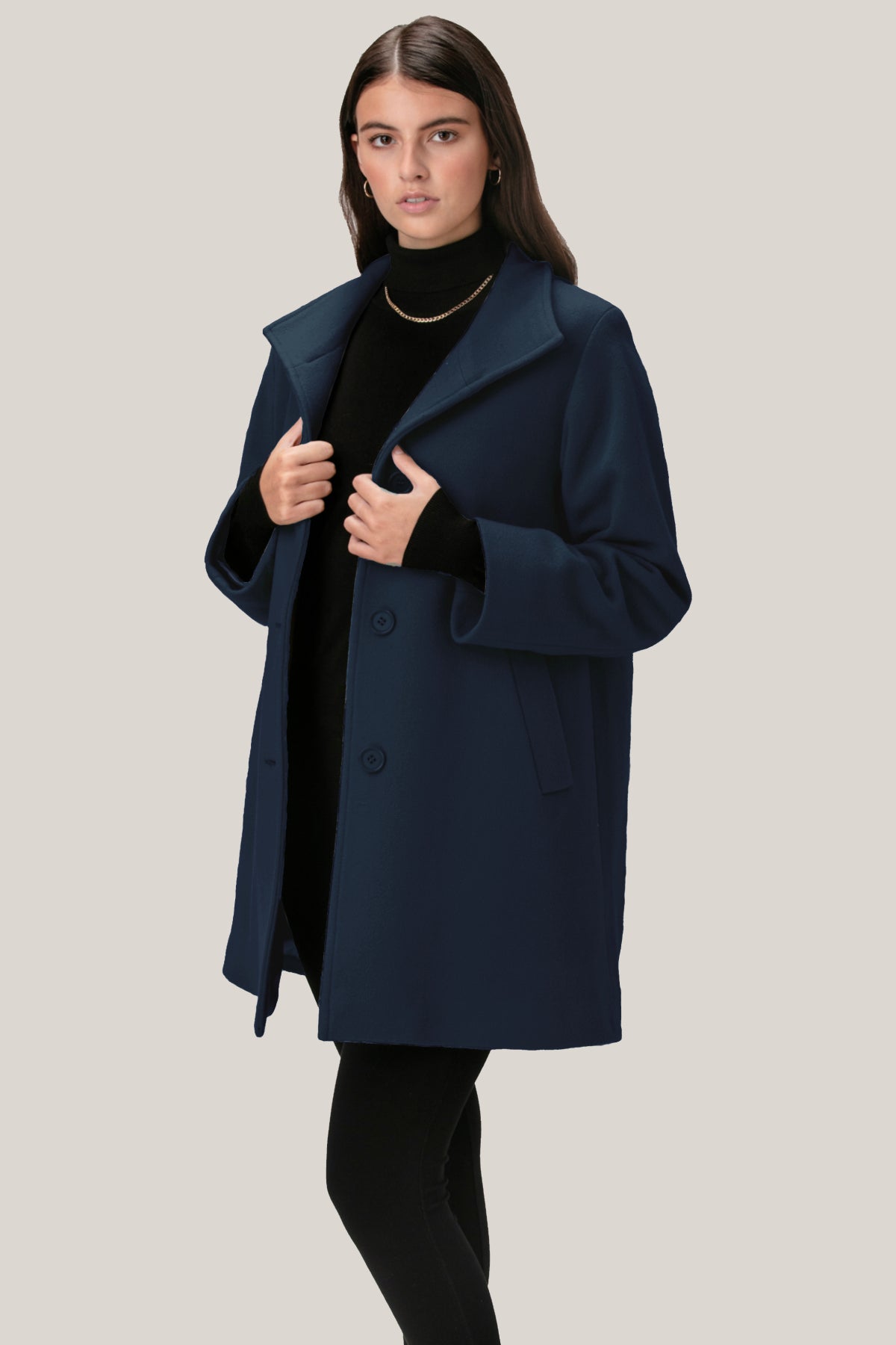 The TRINITY is an elegant swing coat with a classic club collar and raglan sleeves that make layering comfortable.