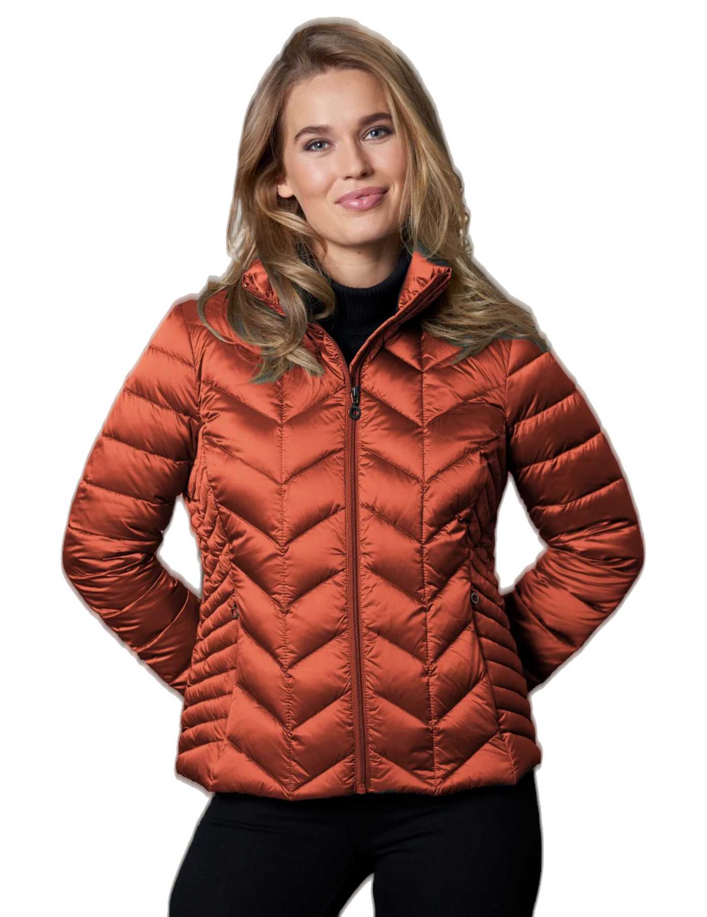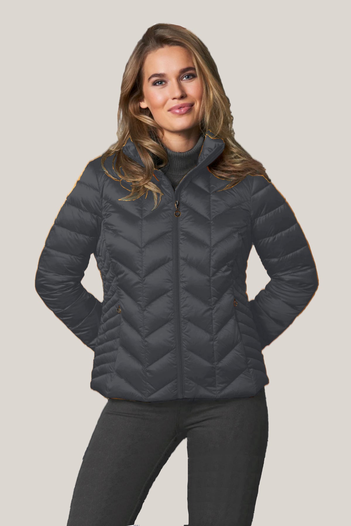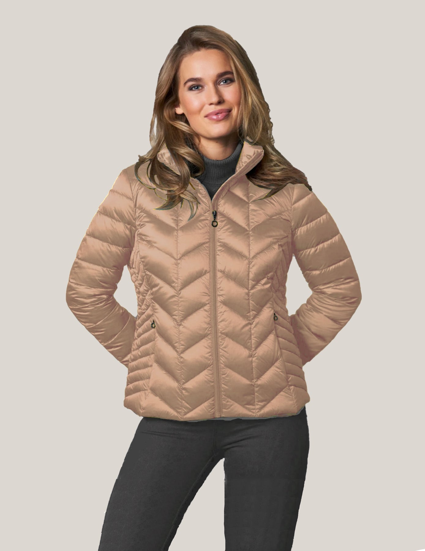 Light down jacket sewn in 2 layers with zipper closure and zippered side pockets. The jacket has an inner pocket. Perfect for transitional weather and travel. May also be layered underneath a wool coat on the extra brisk days. Available in multiple beautiful colours.