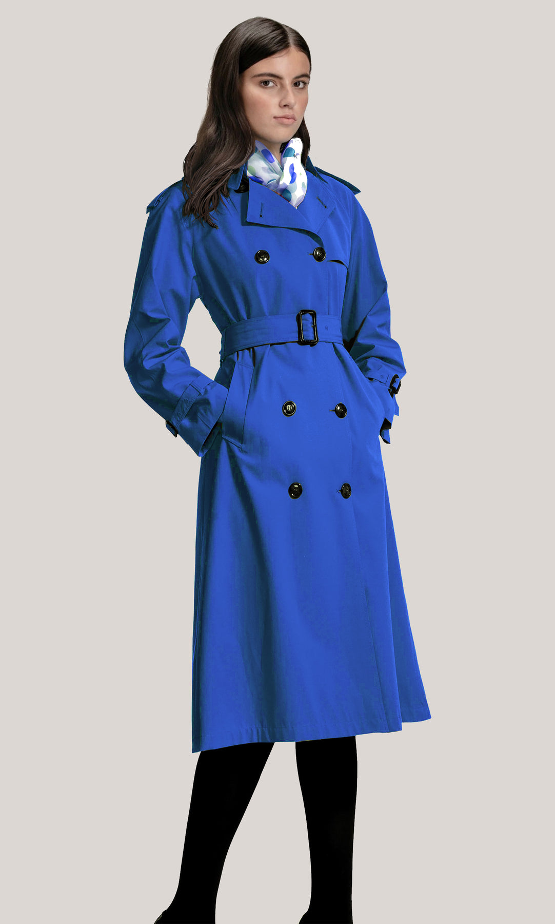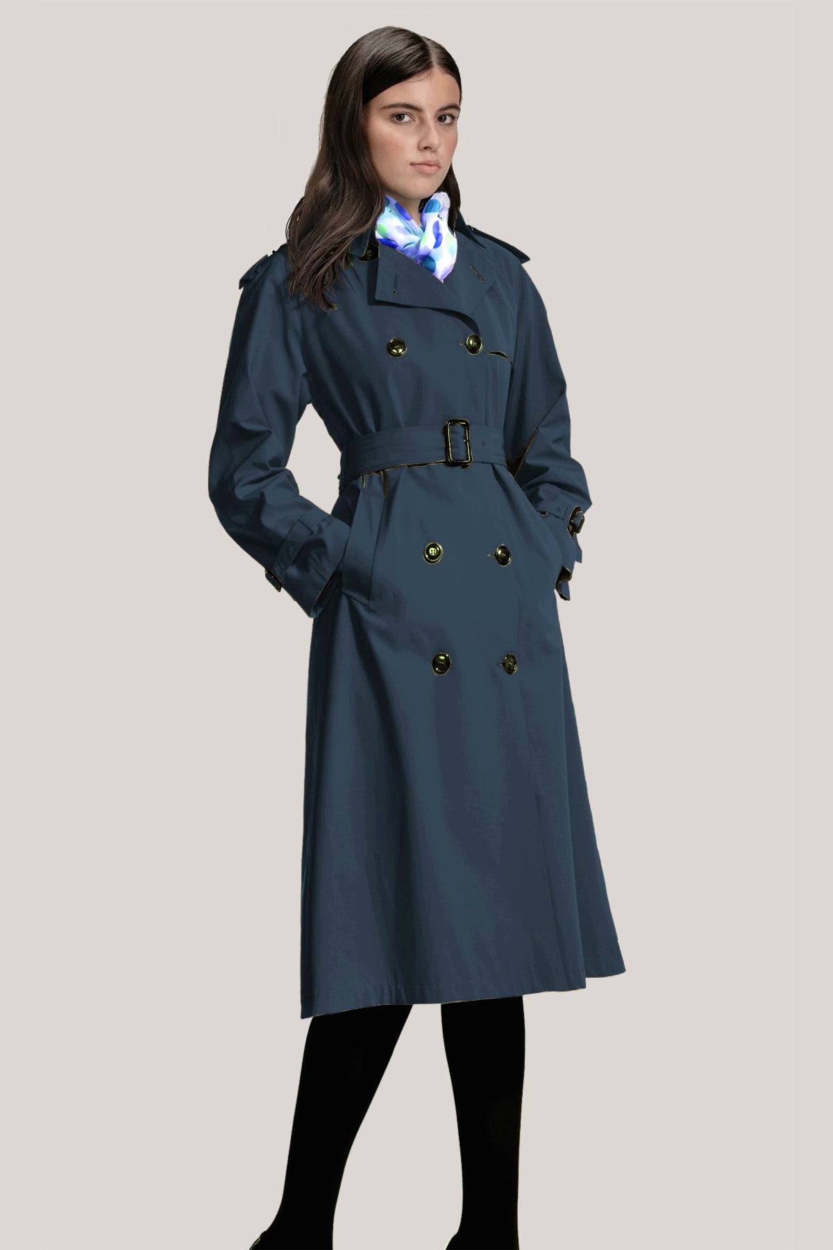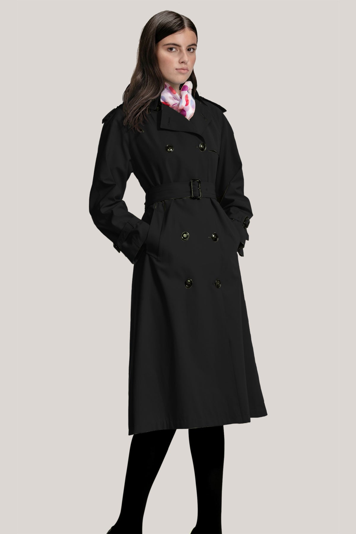 The sophisticated Jasmin Raincoat is a perfect fusion of style and practicality. Designed with fully taped seams, it offers exceptional waterproof protection and a loose A-line silhouette that flatters effortlessly. The medium-length coat includes eyelets under the sleeves for breathability and discreet reflex details for enhanced visibility in various conditions. A concealed front zip under a flap with press buttons and a foldable hood integrated into the collar provide versatility and comfort. Practical elements such as front pockets with press buttons, zipped side pockets, and a secure inner zipped pocket make it an ideal choice for daily wear. The adjustable cuffs and side splits, with contrasting prints and zips, offer ease of movement and a unique, stylish touch.