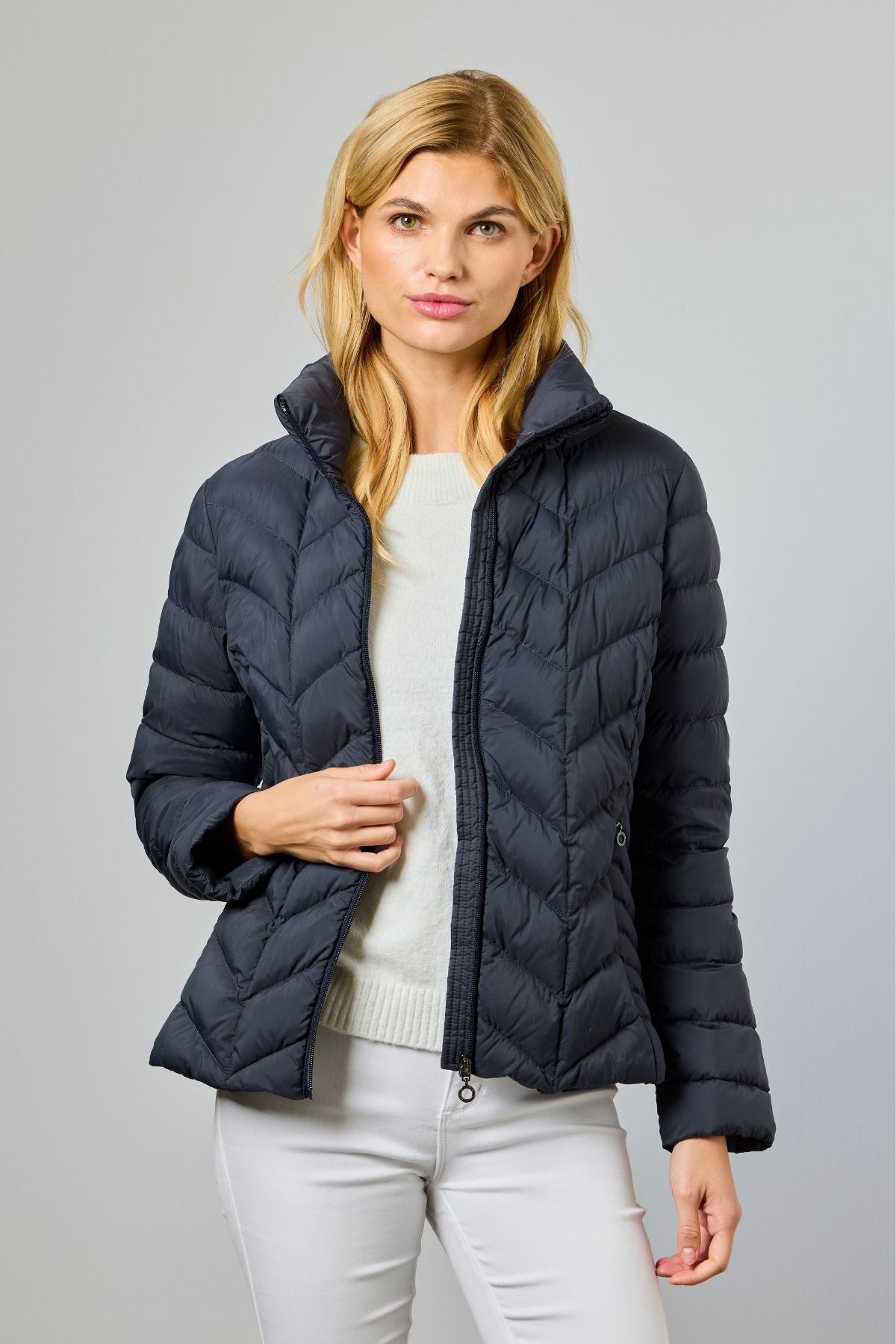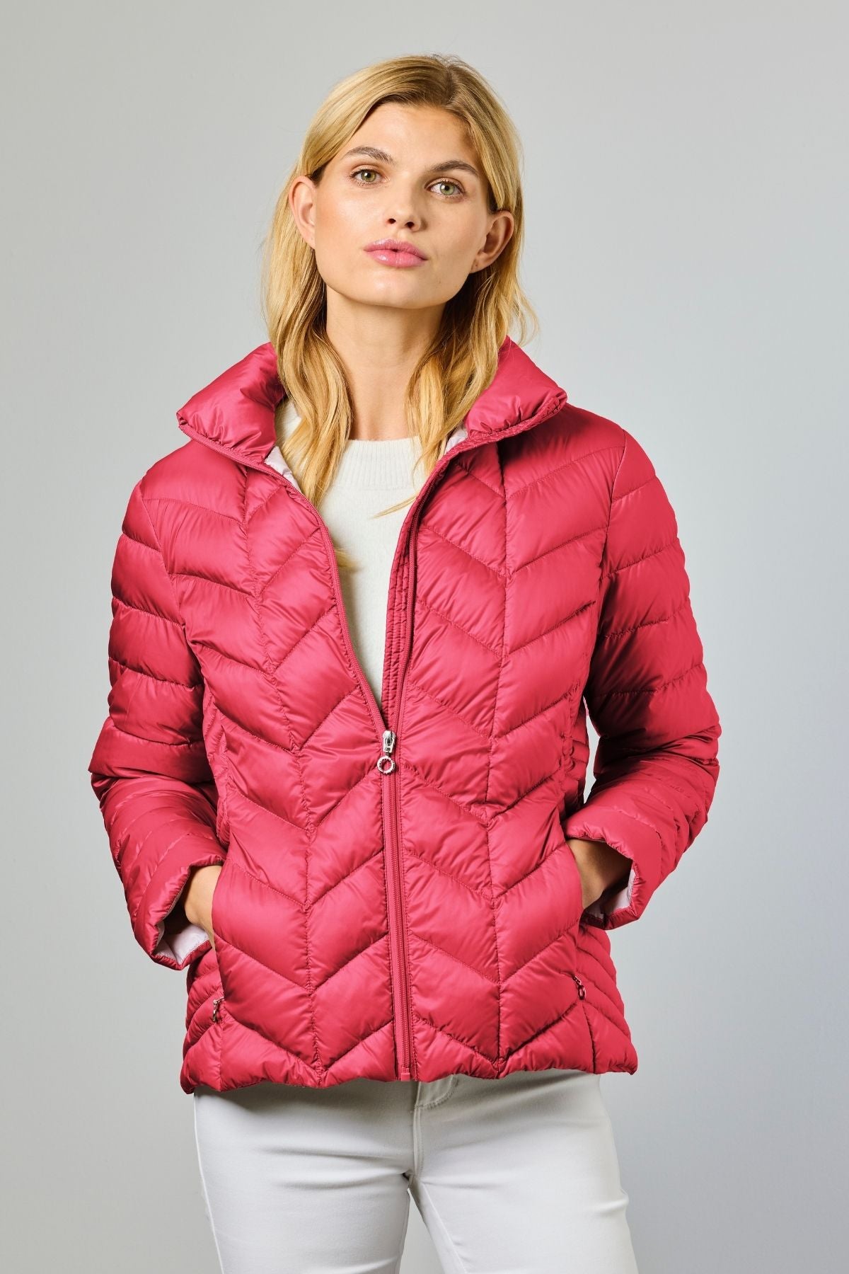 Light down jacket sewn in 2 layers with zipper closure and zippered side pockets. The jacket has an inner pocket. Perfect for transitional weather and travel. May also be layered underneath a wool coat on the extra brisk days. Available in multiple beautiful colours.